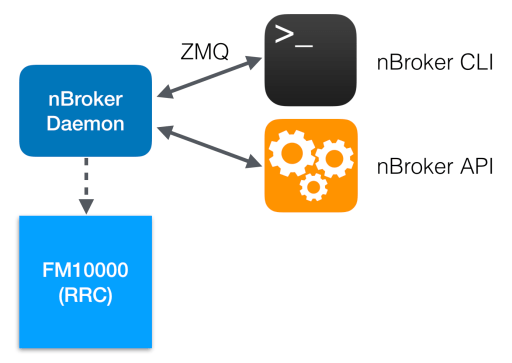 nBroker由驱动RRC交换机的守护程序和可用于配置导向和过滤规则的API组成。通信通过ZMQ通道进行。除了API,还提供了具有自动完成功能的命令行工具来控制适配器。