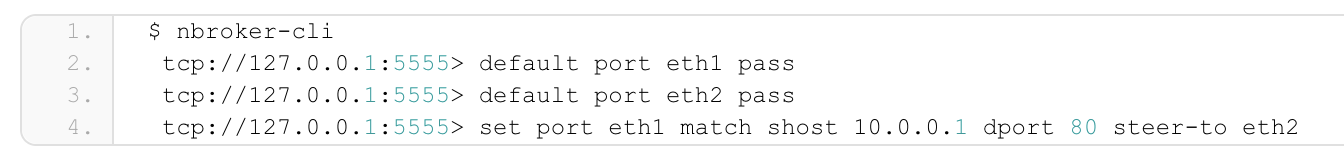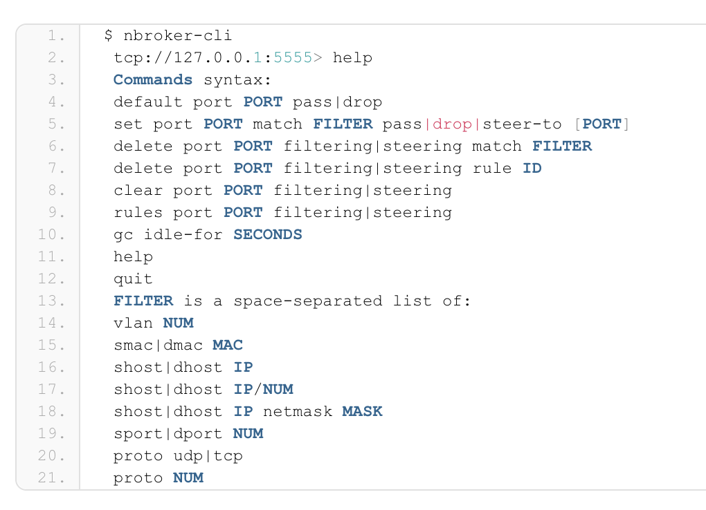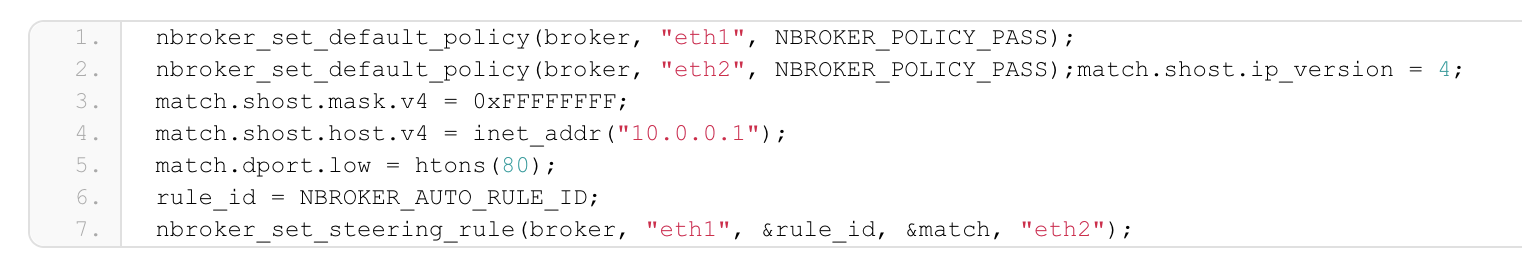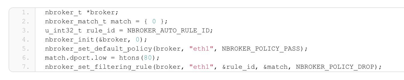 除命令行工具外,nBroker还可以作为C API使用,可用于配置RRC开关。下面概述了一个代码段,该代码段将所有流量传递给与特定目标端口匹配的唯一丢弃流,以证明该API编写自定义应用程序和配置RRC交换机的有效性。要了解更多信息,请阅读API文档。