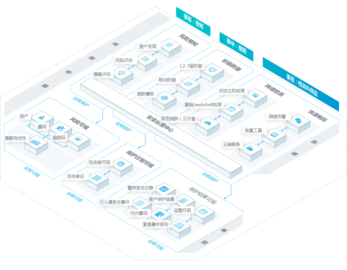 事后:持续检测绕过防御的威胁,并通过云端安全服务提供7*24小时快速响应的技术服务。在IT业务运维全过程内向用户提供对风险的认知、对保护过程的认知和对结果的认知,帮助您的IT系统更简单、更安全、更有价值。